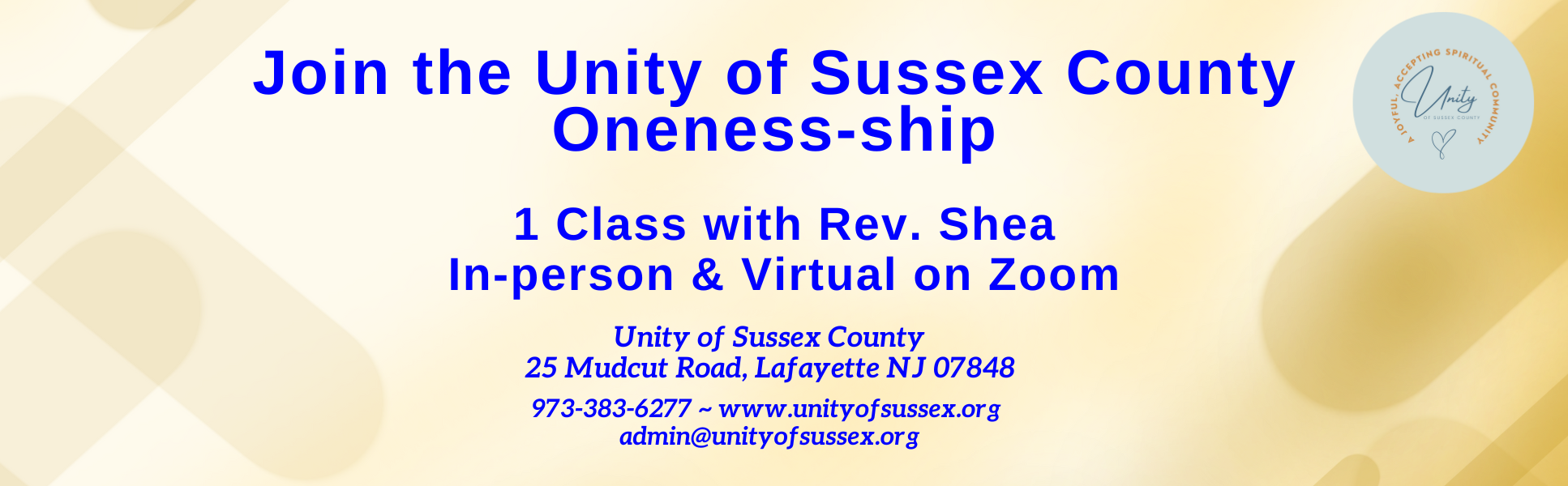 Then you are invited to attend the Unity of Sussex County Oneness-ship class faciliated by Rev. Shea Maultsby. We will explore and learn about the Unity movement and its history, Unity teachings, and Unity of Sussex County.